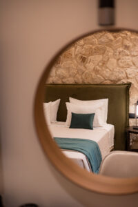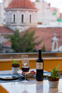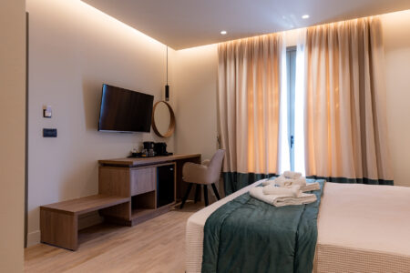 Our deluxe family suite is located on the top floor of our boutique hotel with a unique view of the city.  The suite includes 1 separate bedroom with a king-size bed, a living room with a double sofa bed, a luxurious bathroom, and a spacious balcony with a dining table and 2 lounge chairs. Each space has its own smart tv. Guests can enjoy their wine or coffee while admiring the view of the view and the picturesque neighborhood. These facilities make the room the ideal option for a family or a group of people.