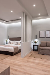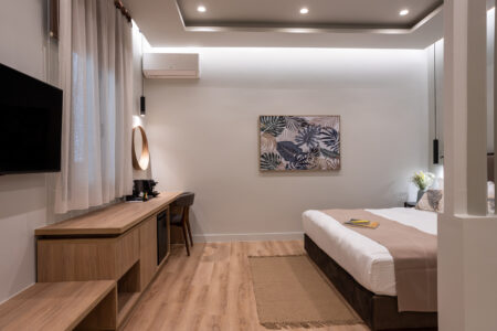 Αυτό το δωμάτιο κυριαρχεί στη μοντέρνα και ζεστή αισθητική χωρίς να χάνει τη φιλοσοφία που υπάρχει από την αρχή στο ξενοδοχείο μας
